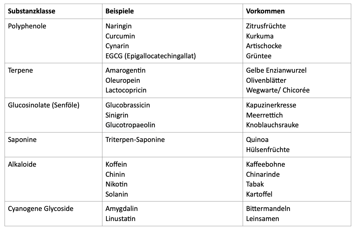 Wie wir heute wissen, gibt es sehr viele verschiedene Gruppen von Bitterstoffen, die sich über unterschiedlichste Pflanzen erstrecken und sich in ihren Eigenschaften extrem voneinander unterscheiden. Allesamt gehören sie zur großen Gruppe der sogenannten sekundären Pflanzeninhaltsstoffe, die über zahlreiche pharmakologische Wirkungen verfügen und der Pflanze selbst als Schutzstoffe dienen.